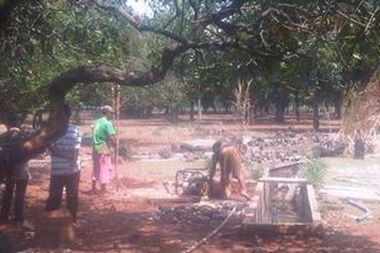 Sejumlah pekerja sedang memperbaiki pompa air di kadang rusa di kawasan Monumen Nasional (Monas). Sekitar 60 ekor rusa tutul dikabarkan terancam mati kehausan, karena pompa air dari kolam penampungan rusak sejak sebulan lalu.