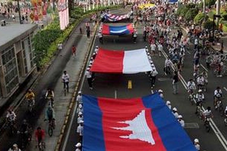 Arak-arakan 10 bendera raksasa negara ASEAN melintasi kawasan Bundaran Hotel Indonesia, Jakarta Pusat, Minggu (30/10/2011). Arak-arakan ini merupakan rangkaian acara ASEAN Fair yang berlangsung selama sebulan mulai dari 24 Oktober hingga 23 November 2011 yang diikuti oleh 10 negara ASEAN. (Tribunnews/Herudin)