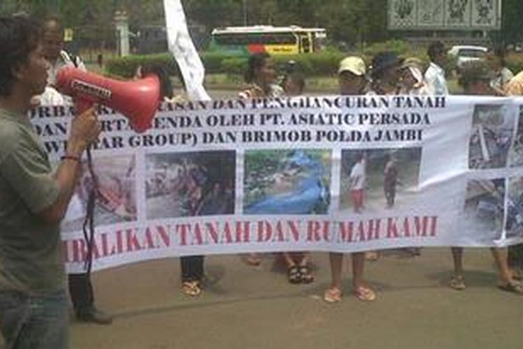 Suku Anak Dalam Bathin 9, salah satu komunitas asli yang hidup di Jambi berorasi di depan Istana Negara, Jakarta Pusat, Senin (19/9/2011). Dalam orasinya mereka menuntut keadilan kepada pemerintah pusat atas kehidupan mereka.