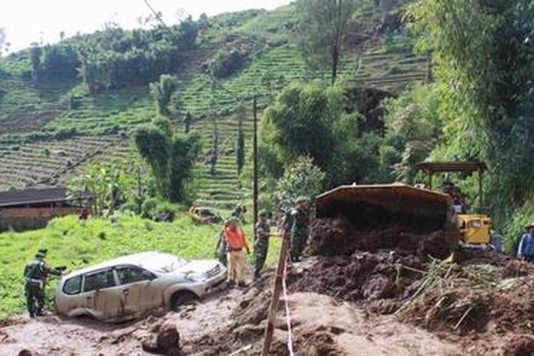 Sejumlah petugas dan warga Tieng, Wonosobo, Jateng, Selasa (20/12/2011), terus berUpaya pembersihkan jalur utama menuju Dieng pasca longsor dan banjir bandang dua hari lalu.(KOMPAS/GREGORIUS MAGNUS FINESSO)