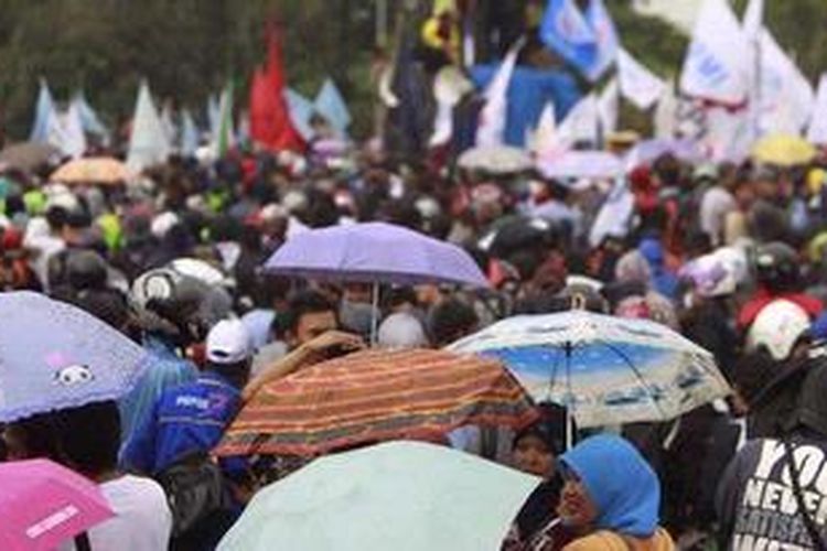 Buruh dan pekerja berunjuk rasa dengan menutup pintu masuk dan keluar tol Cibitung di kawasan industri MM2100 di Cikarang Barat, Bekasi, Rabu (11/1/2012).