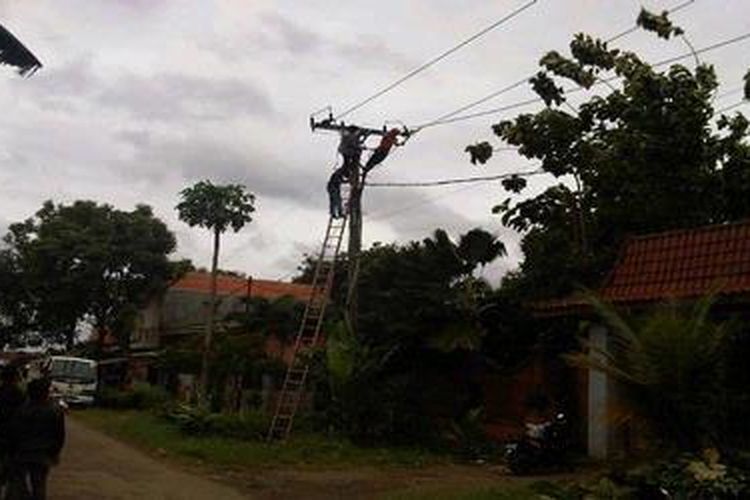 Petugas PLN memperbaiki jaringan listrik yang putus di Kelurahan Kemiri Muka, Kecamatan Beji, Kota Depok, Rabu (25/12012). Jaringan putus karena pohon tumbang saat hujan deras tadi pagi.