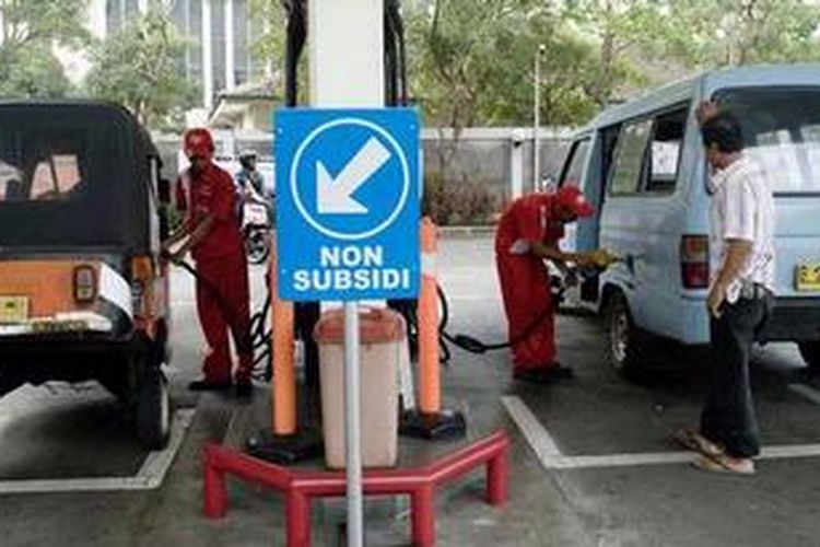 Petugas sedang mengisi bahan bakar minyak ke kendaraan di SPBU Matraman, Jakarta, Rabu (9/3/2011).