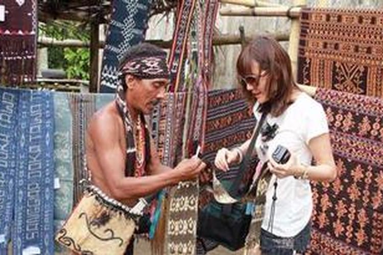 Olga Lydia menikmati tenunan khas Flores di Desa Doka.