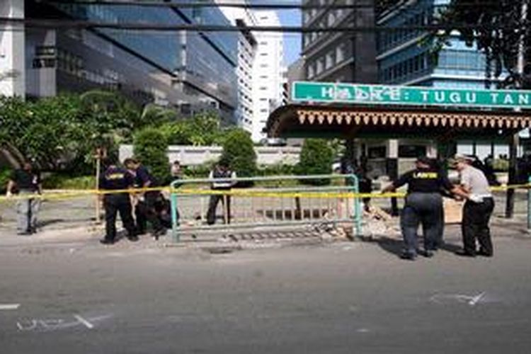 Tim Pusat Laboratorium Forensik dari Polri (Puslabfor) melakukan olah tempat kejadian perkara (TKP) kecelakaan Xenia Maut di Jalan Ridwan Rais, depan Kantor Pelayanan Pajak, Jakarta, Selasa (24/1/2012). Di tempat tersebut Puslabfor menandai sejumlah titik yang terdiri dari lokasi korban tewas dan jalur terjangan mobil Xenia. Tampak bekas darah masih terlihat di sejumlah titik korban tewas. (KOMPAS/LASTI KURNIA)