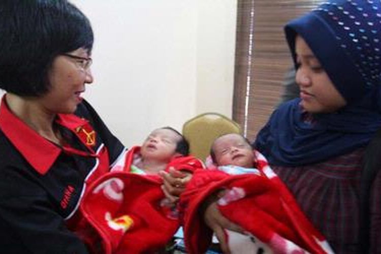 Dua bayi lelaki kembar asal Kota Bogor yang diamankan Polres Kota Depok, Selasa (21/2/2012) ini. Dua bayi ini hendak dijual seorang warga Depok berinisial MS (49).(Kompas/Andy Riza Hidayat)