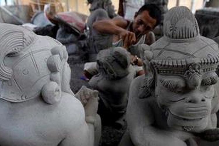 Perajin patung menyelesaikan pembuatan patung cetak di Batubulan, Kecamatan Sukawati, Gianyar, Bali, Minggu (8/5/2011). Batubulan dan Singapadu di Kecamatan Sukawati menjadi sentra pembuatan patung khususnya dari bahan campuran semen dan batu paras serta batu padas. Patung-patung tersebut diekspor hingga ke mancanegara. (KOMPAS IMAGES/KRISTIANTO PURNOMO)