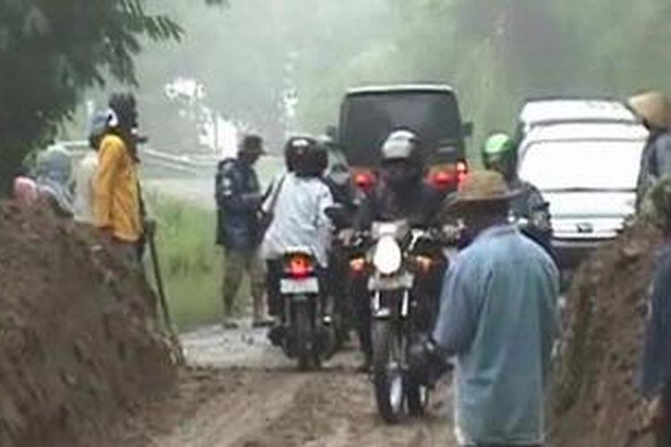 Longsor di Desa Jrakah, Kecamatan Selo, Boyolali, Jumat (9/3/2012) menggagu jalur wisata Solo-Selo-Borobudur.