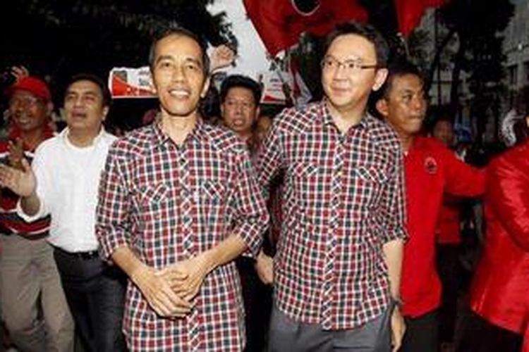 Joko Widodo atau Jokowi (tengah) dan Basuki Tjahaja Purnama (Ahok) didampingi Ketua DPP PDIP Effendi Simbolon (kiri) berjalan menuju kantor Komisi Pemilihan Umum Daerah, Jalan Budi Kemuliaan, Gambir, Jakarta Pusat, Senin (19/3/2012). (KOMPAS IMAGES/RODERICK ADRIAN MOZES )