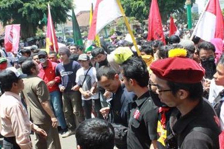 Unjuk rasa mahasiswa dari Aliansi Rakyat Banyumas Bersatu (Alatbambu), Kamis (29/3/2012), di depan Kantor Bupati Banyumas, Jawa Tengah.