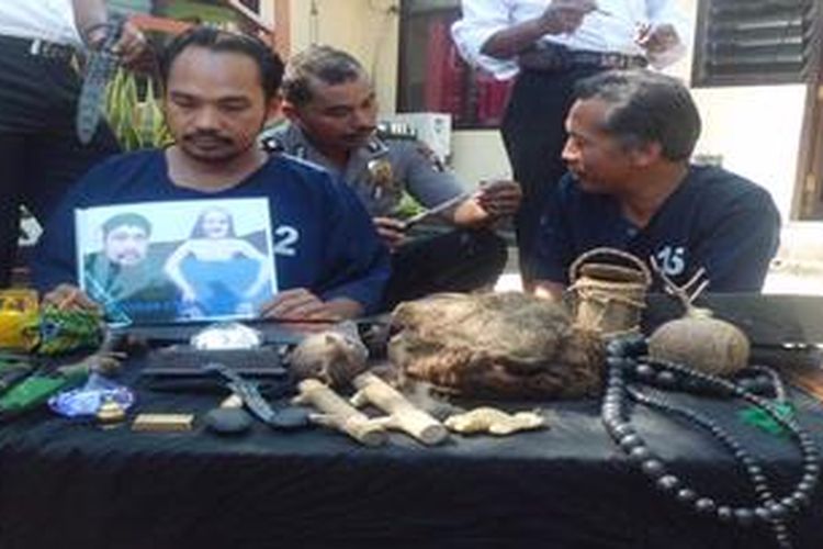 Dua dukun gadungan dan barang bukti untuk ritual penggandaan uang di perlihatkan kepada wartwan saat gelar perkara di mapolres Demak, Senin (23/4/2012)