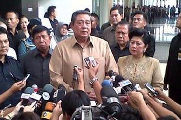 Presiden RI Susilo Bambang Yudhoyono dan Ibu Negara Ani Yudhoyono memberikan keterangan pada wartawan usai menjenguk Menteri Kesehatan Endang Rahayu Sedyaningsih di RSCM, Jakarta, Kamis (26/4/2012). Ia dirawat karena mengidap penyakit kanker paru-paru.(MARIA NATALIA/KOMPAS.com)