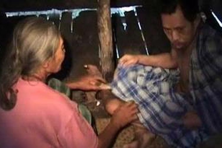 Hari, mantan Tenaga Kerja Indonesia (TKI) asal Bone Sulawesi Selatan tengah menjalani pemasungan selama puluhan tahun dengan perawatan Ibunya yang sudah uzur. Senin,(07/05/2012)(KOMPAS.com/ABDUL HAQ)