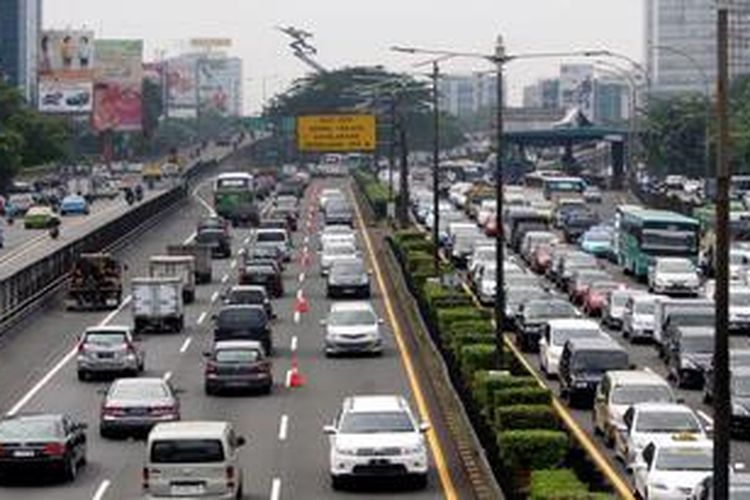 Sejumlah kendaraan melaju di jalur yang berlawanan memanfaatkan sistem Contra Flow yang mulai diberlakukan di jalur tol dalam kota dari arah Cawang ke Semanggi, Jakarta, Selasa (1/5/2012). Polda Metro Jaya mulai melaksanakan sistem ini setiap pagi mulai dari pukul 06.00 - 10.00 wib, untuk mengurai kemacetan. Sistem ini diberlakukan sementara menunggu JoRR W2 dari Pondok Pinang-Kebun Jeruk selesai dibangun. (KOMPAS/LASTI KURNIA)