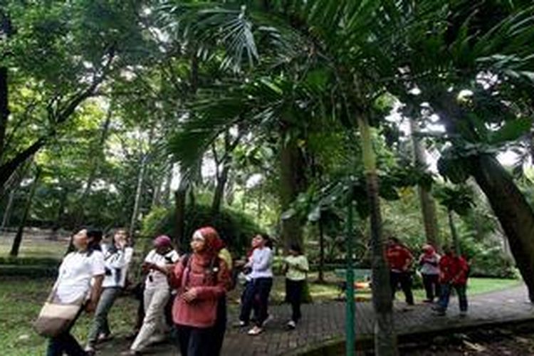 Komunitas Peta Hijau Jakarta mengajak anggota dan rekan dari beragam komunitas berjalan-jalan, mengenal biodiversitas di Taman Langsat, Kebayoran Baru, Jakarta, Sabtu (21/4/2012). Pada acara tersebut diluncurkan juga buku Memetakan "Hijau" Kota yang berisi cara membuat peta hijau dan mengenalkan 30 titik hijau di Jakarta. (KOMPAS/LASTI KURNIA)