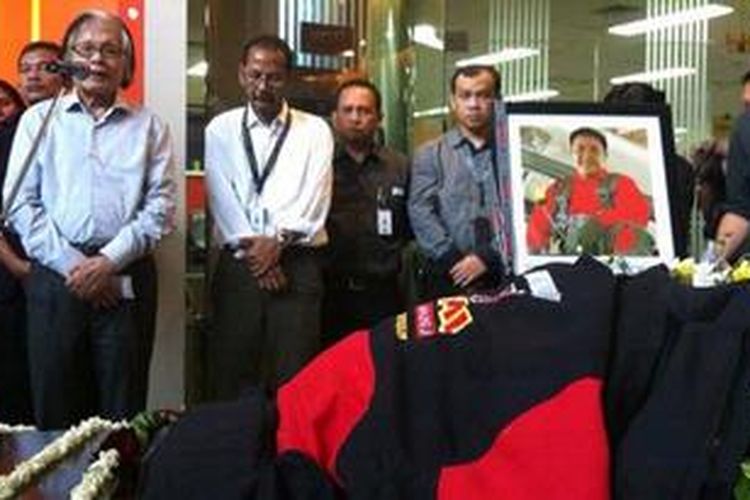 Pendiri Kelompok Kompas Gramedia Jakob Oetama dalam acara pelepasan jenazah Dody Aviantara dan Didik Nur Yusuf yang disemayamkan di Kantor Majalah Angkasa di Gedung Kompas Gramedia, Jalan Panjang, Rabu (23/5/2012).