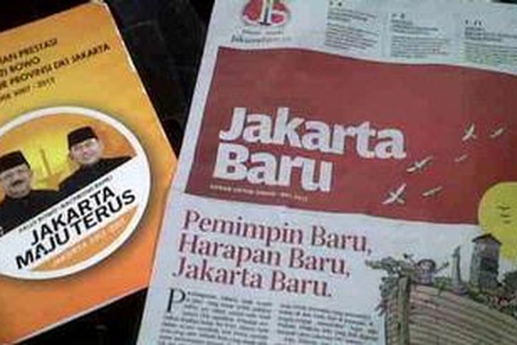 Buklet rangkuman prestasi Fauzi Bowo sebagai Gubernur DKI Jakarta periode 2007-2012 dan koran Jakarta Baru milik Jokowi-Ahok.