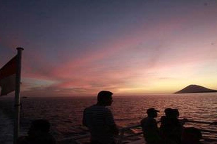 Penumpang KM Valerine jurusan Manado - Talaud menunggu matahari tenggelam di perairan Bunaken, Manado, Provinsi Sulawesi Utara, Rabu (29/7/2009). Sekitar 150 kapal pesiar dan 30 kapal perang asing dijadwalkan mengikuti Sail Bunaken di Manado, 12-20 Agustus 2009. Kegiatan ini antara lain diisi dengan reli kapal pesiar, parade kapal perang, dan kunjungan wisata ke sejumlah provinsi di Indonesia.(KOMPAS/AGUS SUSANTO)