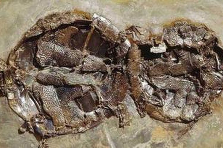 Salah satu dari 9 pasang fosil kura-kura Allaeochelys crassesculpta yang ditemukan dalam posisi kawin. Individu jantan adalah yang ada di sebelah kanan, berukuran 20 persen lebih kecil dari betinanya. (Naturmuseum Senckenberg in Frankfurt)