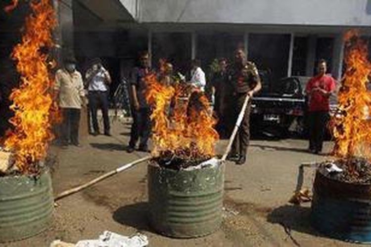 Barang bukti kejahatan dimusnahkan di Kejaksaan Negeri Jakarta Selatan, Kebayoran Baru, Jakarta, Kamis (21/6/2012). Kejaksaan Negeri Jakarta Selatan memusnahkan 27 kilogram ganja, 32 gram Heroin, 185 gram metamfetamina, 233 butir ekstasi, hingga 13 pucuk senjata api. Semua barang bukti ini didapat dari ratusan perkara. (KOMPAS IMAGES/RODERICK ADRIAN MOZES)