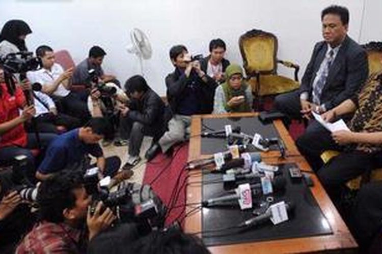 Tersangka dugaan korupsi proyek pengadaan Al Quran di Kementerian Agama senilai Rp 35 miliar, Zulkarnaen Djabar (kanan, berbatik cokelat) memberikan keterangan kepada wartawan terkait kasus yang membelitnya di Kompleks Parlemen, Senayan, Jakarta, Senin (2/7/2012). Anggota Komisi VIII yang juga anggota Badan Anggaran DPR dari Fraksi Partai Golkar tersebut siap diperiksa Komisi Pemberantasan Korupsi. (KOMPAS/HENDRA A SETYAWAN )
