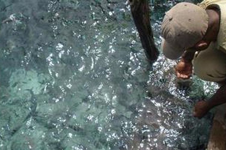 Memberi makan ikan di dermaga Desa Sawinggrai, Raja Ampat