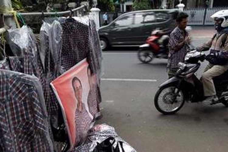 Simpatisan pasangan cagub DKI Jakarta, Joko Widodo dan Basuki Tjahaja Purnama menjual atribut khas pasangan calon tersebut di Jalan Yusuf Adiwinata, Menteng, Jakarta Pusat, Senin (27/8/2012).(KOMPAS IMAGES/KRISTIANTO PURNOMO)