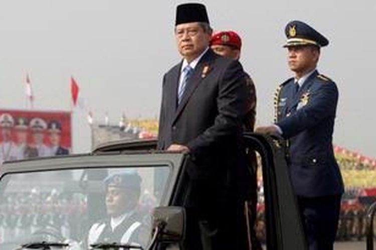 Presiden RI, Susilo Bambang Yudhoyono melakukan inspeksi pasukan pada upacara Hari Ulang Tahun Tentara Nasional Indonesia ke-67 di Halim Perdanakusuma, Jakarta, Jumat (5/10/2012). Sejumlah atraksi militer seperti penerjunan, manuver pesawat, dan gelar pasukan memeriahkan acara ini. (KOMPAS IMAGES/KRISTIANTO PURNOMO )