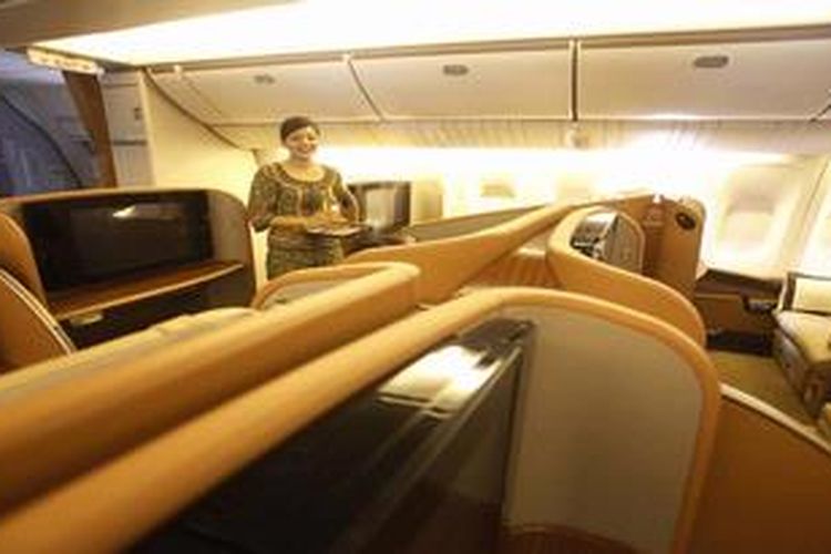 Ilustrasi. Suasana di kelas pertama pesawat Singapore Airlines Boeing 777-300 R.