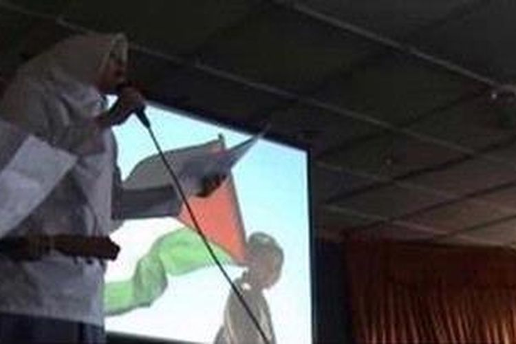 Seorang siswa di Solo membacakan puisi perdamaian untuk Palestina.