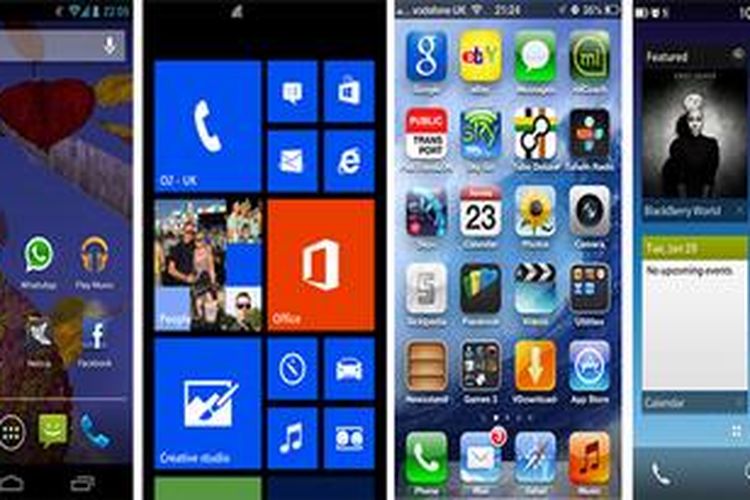 Tampilan homescreen Android (paling kiri), Windows Phone 8 (kedua dari kiri), iOS6 (kedua dari kanan), dan BlackBerry 10