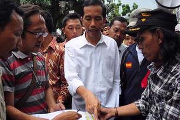 Perwakilan pedagang kaki lima menunjukkan gambaran relokasi yang diinginkan oleh mereka kepada Gubernur DKI Jakarta Joko Widodo (tengah) di kawasan Kota Tua, Jakarta Barat, Kamis (20/12/2012). Kedatangan Jokowi untuk menengok ratusan pedagang yang berunjuk rasa menolak relokasi. Setelah memantau kawasan ini, Jokowi akan memanggil camat, Satpol PP yang menjaga kawasan Kota Tua dan perwakilan pedagang kaki lima ke balai kota untuk memusyawarahkan lokasi yang pantas untuk berjualan. (KOMPAS IMAGES/ANDREAN KRISTIANTO)