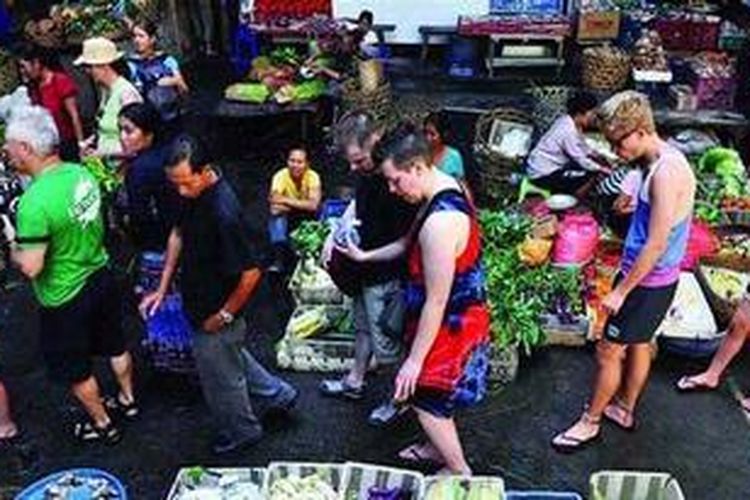 Wisatawan asing mengikuti program wisata Market Tour, yaitu jalan-jalan di pasar tradisional, salah satunya di Pasar Ubud, Gianyar, Bali, Selasa (9/4/2013). Oleh pemandu, turis asing ini diajak untuk mengenal beberapa komoditas yang dijual pedagang, seperti sayur, buah, dan bumbu masakan.(KOMPAS/HERU SRI KUMORO)