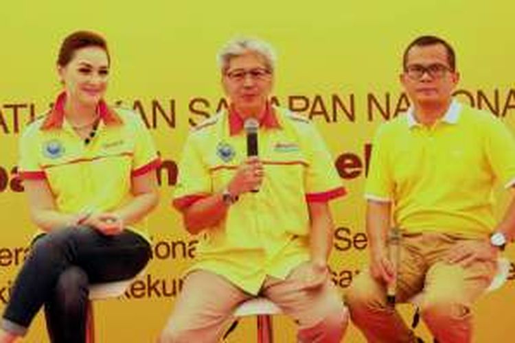 Mona Ratuliu, Marketing Director PT Mayora Indah Goesnawan dan Ketua Umum Pergizi Pangan Indonesia Prof. Dr. Ir. Hardinsyah saat menghadiri sesi konferensi pers acara kampanye ‘Sarapan Sehat Sebelum Jam 9’ pada Minggu (20/3/2016) di Parkir Timur Senayan.()