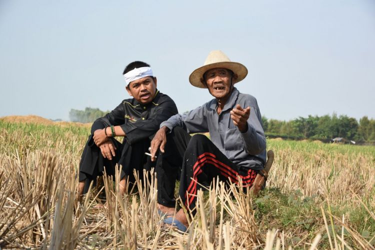 Bupati Purwakarta Dedi Mulyadi (kiri, pakai baju hitam) berbincang dengan salah satu warga di tengah areal sawah