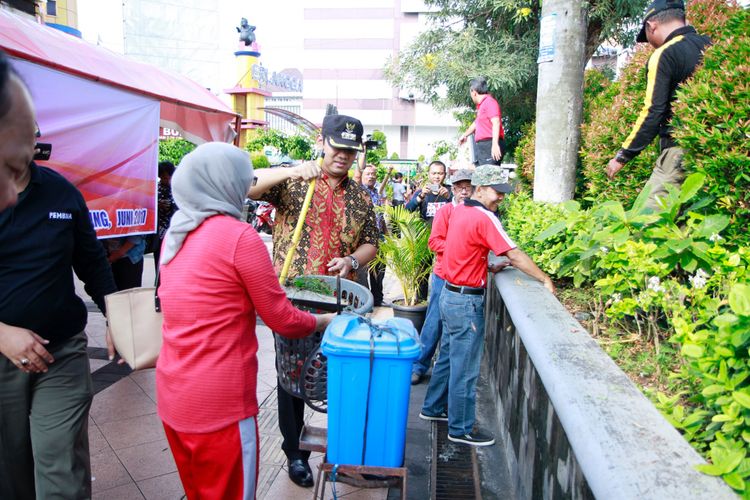 Wali Kota Semarang dan pedagang kaki lima bergotong royong membersihkan kawasan Simpang Lima dalam menyambut libur lebaran 2017. Aksi Bersih Simpang Lima digelar pada Kamis (22/6/2017)