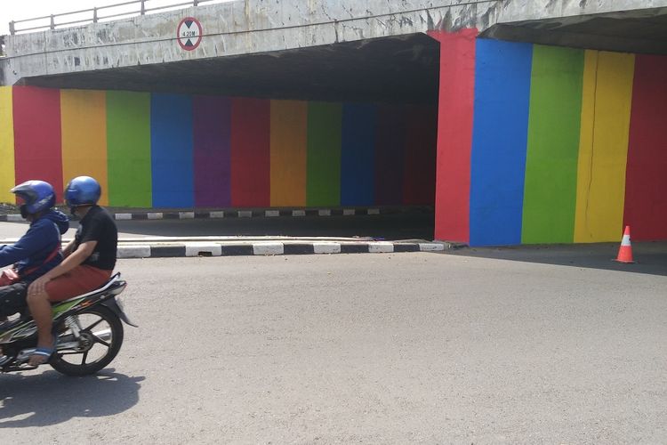 Menyambut pemudik Lebaran 2017, Kota Semarang mengecat dinding terowongan di Jalan Arteri Soekarno Hatta dengan aneka warna ceria.