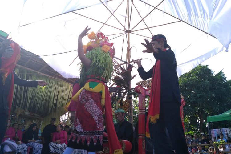 Fadiah Yulianti (12), gadis belia yang terpilih sebagai penari Seblang dalam keadaan kejiman (kerasukan roh leluhur). Ritual Seblang merupakan ritual mistis yang masih dilestarikan masyarakat Desa Olehsari, Banyuwangi. Keunikan tradisi ritual Seblang yang digelar setahun sekali menjadi daya tarik wisata. (FIRMAN ARIF/KOMPAS.com)