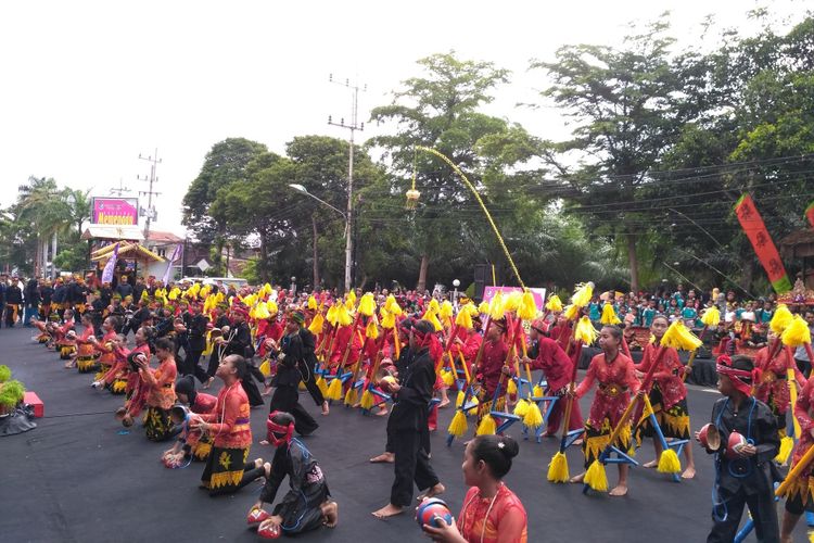 Permainan tradisional Egrang Bambu dan Egrang Bathok ditampilkan anak-anak dari Kecamatan Giri dalam Festival Memengan Tradsional 2017. Lebih dari 5000 anak terlibat dalam festival permainan tradisional Banyuwangi yang digelar Sabtu (22/7/2017).(FIRMAN ARIF/KOMPAS.com)