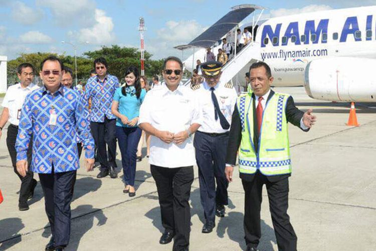 Menteri Pariwisata Arief Yahya dan Presdir Sriwijaya Air Chandra Lie (kiri) tiba di Bandara Blimbingsari, Banyuwangi, Jawa Timur, Jumat (16/6/2017) menggunakan pesawat NAM Air yang melayani penerbangan perdana Jakarta-Banyuwangi.