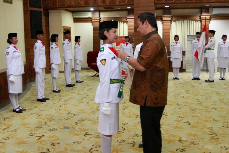 Walikota Semarang Hendrar Prihadi, Senin (14/8/2017), mengukuhkan 27 pelajar SMU/SMK sederajat Kota Semarang sebagai Pasukan Pengibar Bendera Pusaka (Paskibraka) Kota Semarang. Paskibraka itu terdiri 14 perempuan dan 13 lak-laki.(Dok Pemkot Semarang)