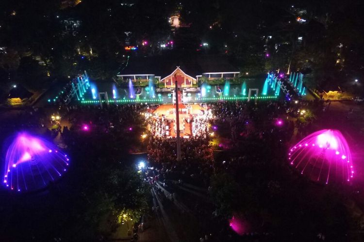 Air mancur menari di Taman Pesanggrahan Padjadjaran Komplek Alun-alun Kabupaten Purwakarta dilihat dari atas saat malam hari.(Dok. Pemkab Purwakarta)