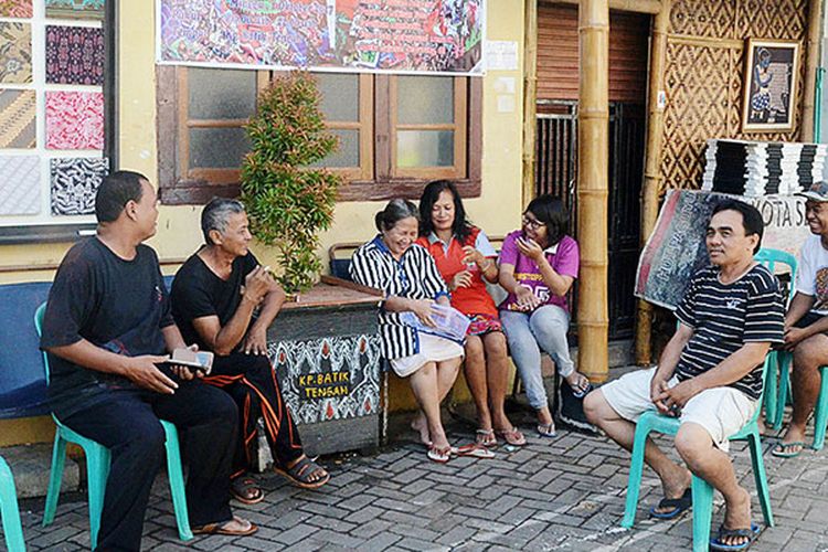 Sejumlah warga tengah menikmati salah satu sudut Kampung Jadhoel, Selasa (2/5/2017) setelah mengalami perbaikan lingkungan. Ini merupakan kampung lama, pusat batik dengan nama kampung Kampung Batik Tengah berada di Kecamatan Rejomulyo, Kecamatan Semarang Timur, Kota Semarangt, Jawa Tengah. sebagai kampung pusat batik, hiasan dinding rumah warga dihiasasi hiasan contoh motif batik, supaya memudahkan wisatawan mengetahui jenis motif batik khas di kampung pusat batik ini. (KOMPAS/WINARTO HERUSANSONO)