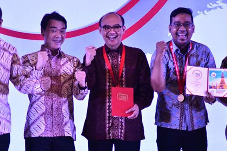 Senior Manager PT. Bank Central Asia Tbk Equarry Harlan (tengah) berfoto bersama seusai meraih penghargaan platinum dalam kategori Manager Contact Center – Large di kompetisi The Best Contact Center Indonesia 2017 di Hotel Bidakara, Jakarta, Jumat (11/8/2017) malam lalu.(KOMPAS.COM/Dylan Aprialdo Rachman)