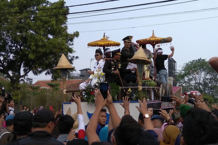 Bupati Purwakarta Dedi Mulyadi ikut dalam perarakan mobil hias dalam peringatan Kemerdekaan RI ke-72, Kamis (17/8/2017).
