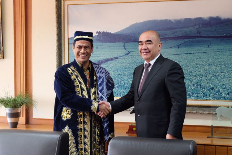 Menteri Pertanian Andi Amran Sulaiman (kiri) bersalaman dengan Zoir T Mirzaev, Deputi Perdana Menteri merangkap Menteri Pertanian dan Sumberdaya Air Uzbekistan (kanan) pada Senin (21/8/2017) di Kementerian Pertanian. Indonesia menginginkan Uzbekistan membantu kampanye positif kelapa sawit.(Humas Kementerian Pertanian)