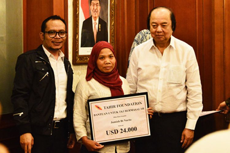 Menteri Tenaga Kerja dan Transmigrasi, Muhammad Hanif Dhakiri (paling kiri) bersama dengan Pengusaha Sri Tahir memberi bantuan kepada 12 tenaga kerja Indonesia yang berhasil dipulangkan dari Yordania di Kementerian Tenaga Kerja dan Transmigrasi, Jakarta, Kamis (7/9) malam. ()