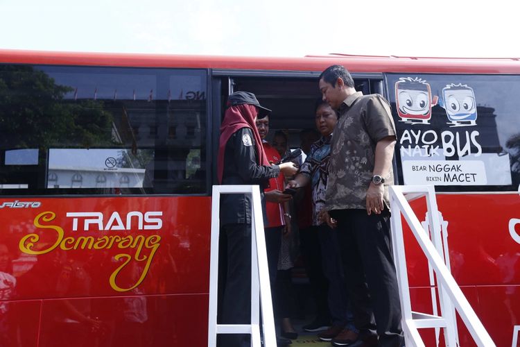 Wali Kota Semarang Hendrar Prihadi mencoba T-Cash saat hendak naik bus rapit transit, Jumat (18/8/2017)
