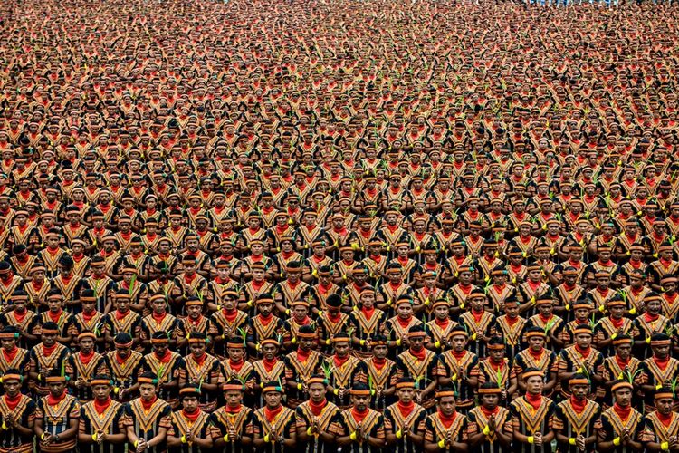 Ribuan penari tampil pada geladi resik pagelaran tari tradisional Saman massal di Stadion Seribu Bukit, Blang Kejeren, Gayo Lues, Aceh, Sabtu (12/8/2017). Pagelaran Tari Saman itu memecahkan rekor dunia dari Museum Rekor Indonesia ( MURI) dengan jumlah penari terbanyak di dunia, yakni 12.262 orang yang berasal dari berbagai komponen masyarakat.(AFP PHOTO/CHAIDEER MAHYUDDIN)