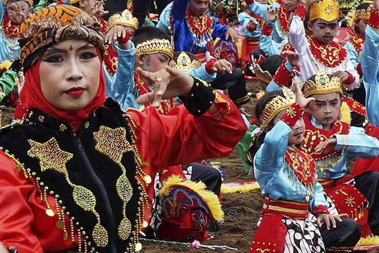 Lebih dari 300 murid dan 50 guru pendidikan anak usia dini menari Turangga Yaksa untuk memeriahkan Prigi Fest 2017 di Pantai Prigi, Trenggalek, Jawa Timur, Minggu (26/3/2017). Festival tahunan yang digagas dan diwujudkan oleh warga Prigi ini sudah berjalan sejak 2015 dengan tujuan memopulerkan Pantai Prigi dan pesisir Trenggalek.(KOMPAS/AMBROSIUS HARTO)